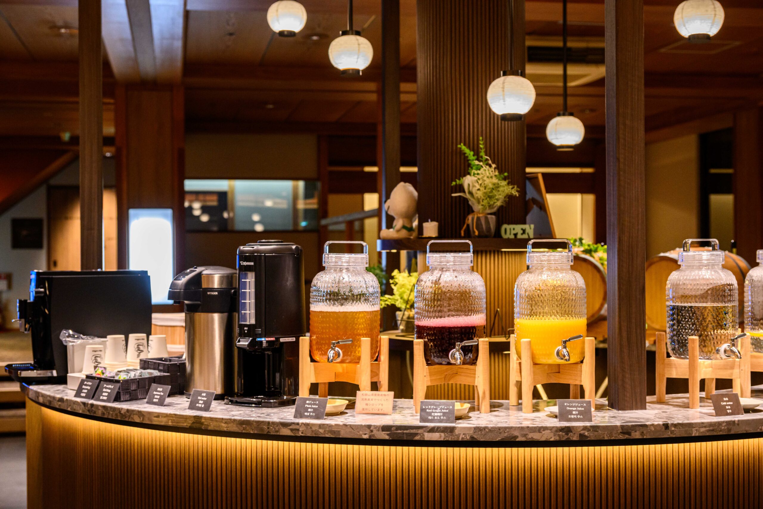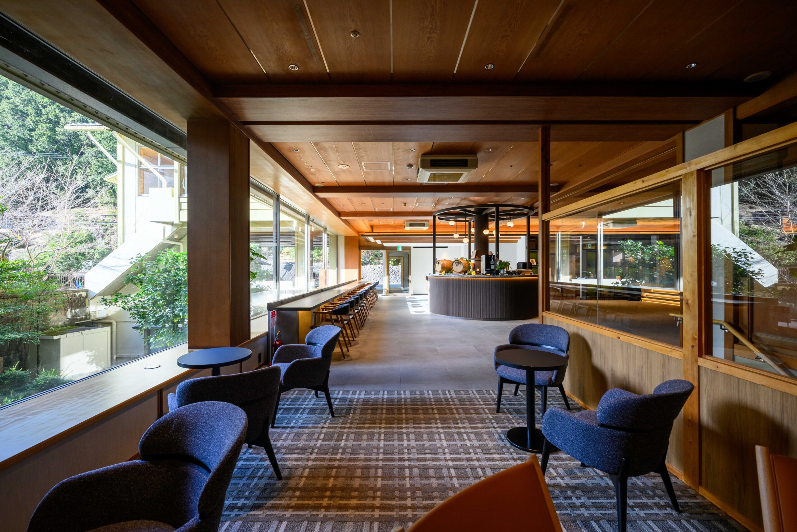 グリーンビューの魅力を活かしたロビーラウンジは、「温泉宿の寛ぎ」をコンセプトにご宿泊のお客様限定で、地元の特産品を取り入れたジュース、お茶などのお飲み物や、お酒、おつまみをフリーでお楽しみいただけます。