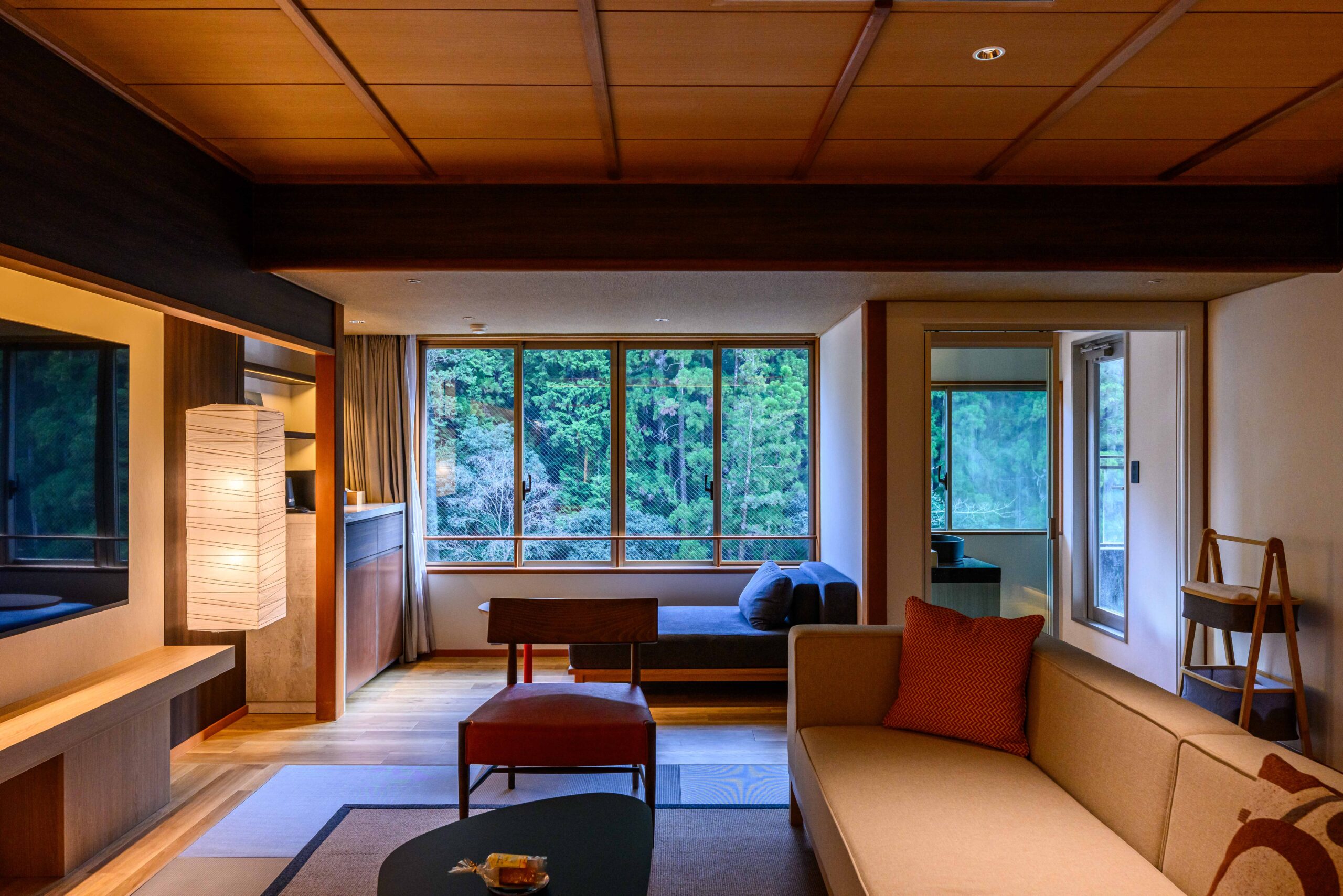 室内に露天風呂を設け、窓際にはデイベッドとミニバーを配置し、豊かな緑を眺めながら、自然と一体化したような安らぎのひとときをお過ごしいただけます。ベッドとソファスペースを緩やかにつなぐ設計により、心地よく開放的な滞在を演出します。(禁煙)